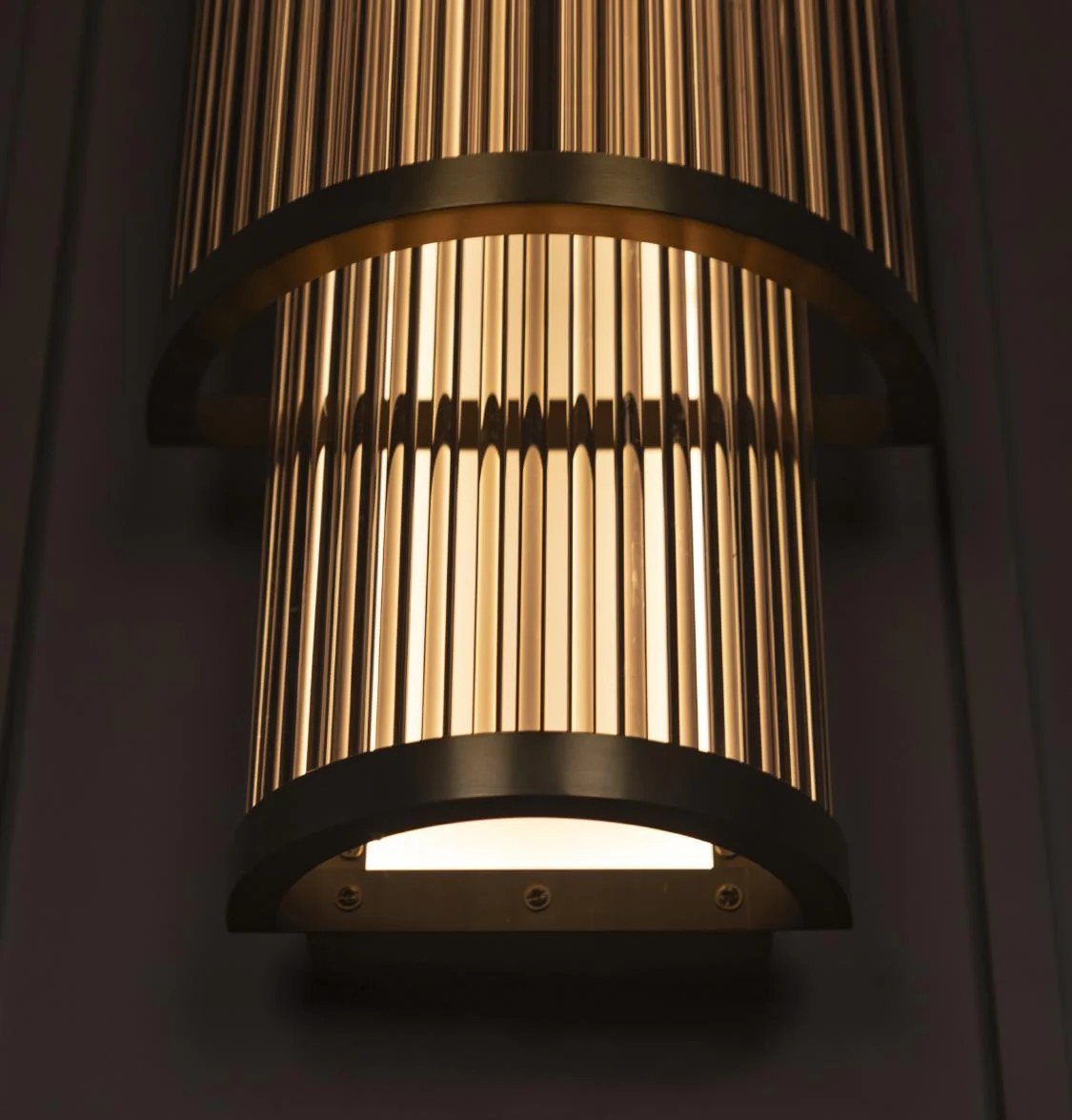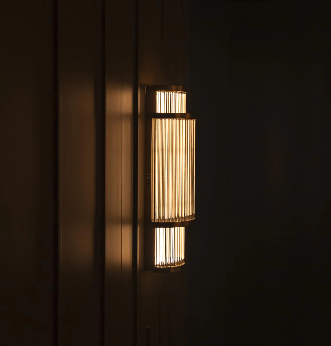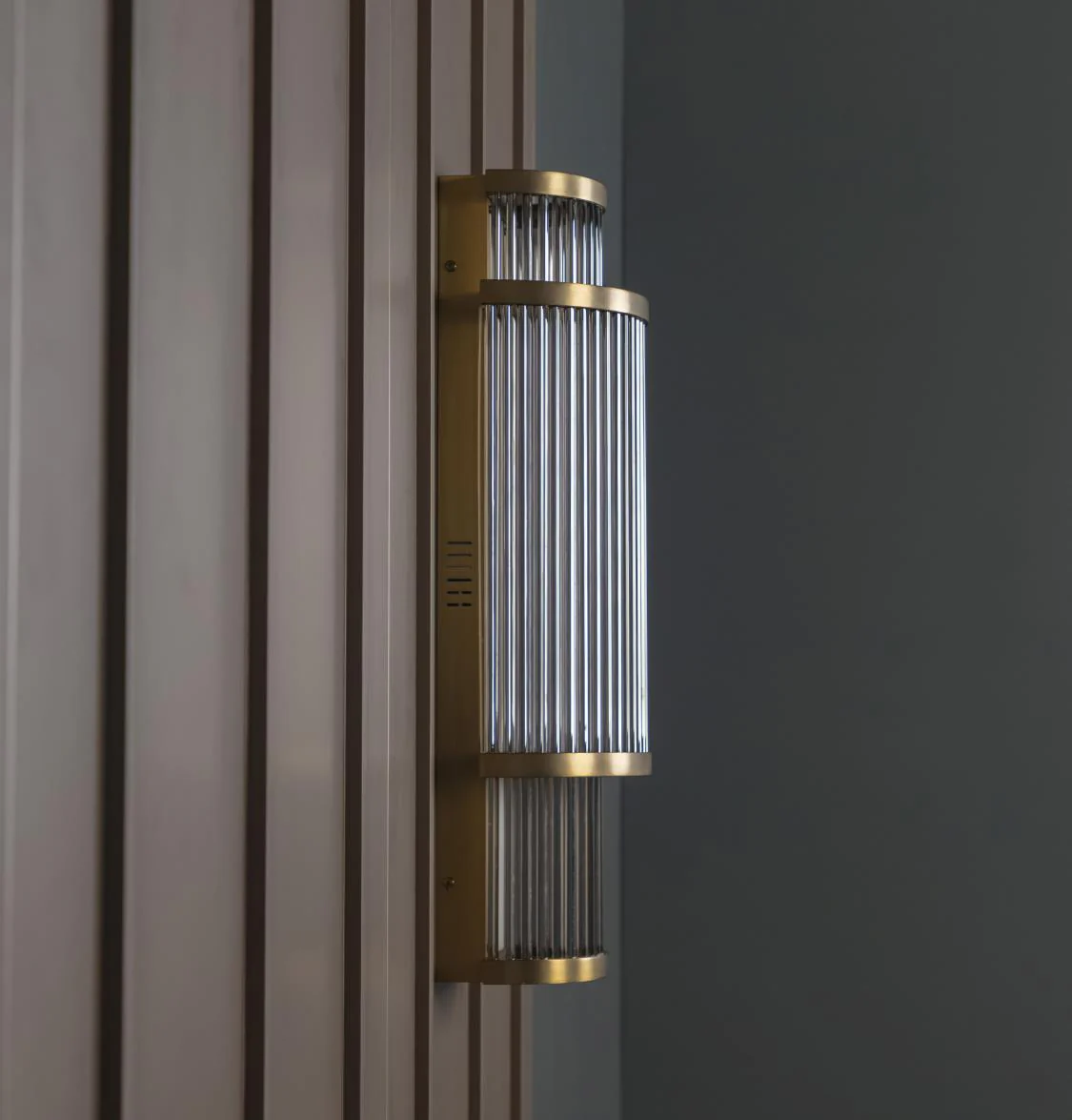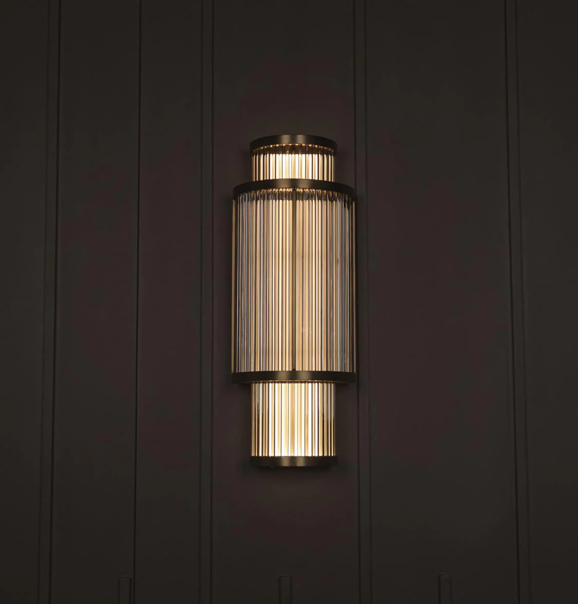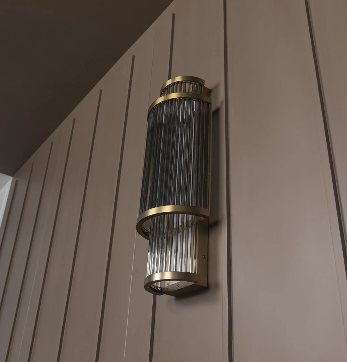 Nablus Aplik, şeffaf cam çubukları ve eskitme gövdesiyle duvarda şık bir ışık tüneli etkisi yaratır. Cam detaylar ışığı kırarak zarif bir yansıma sunar.